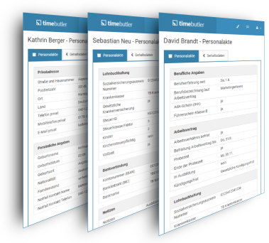 Mit Timebutler können Sie für jeden Mitarbeiter eine Personalakte führen. Sie können den Aufbau und die Felder der Personalakte an Ihre Bedürfnisse anpassen und gestalten. Mit Hilfe der Auswertungsmöglichkeiten können in kürzester Zeit beliebige Informationen aus dem Personalstamm ermittelt werden.
