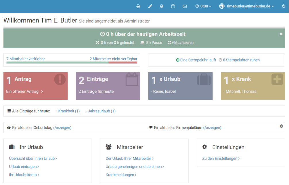 Ihre Mitarbeiter haben die Zugangsdaten erhalten und können sich am Timebutler anmelden. Sie haben als Admin den Überblick über alle Mitarbeiter und können weiterhin Einstellungen vornehmen und auch zukünftig Nutzerkonten erstellen.