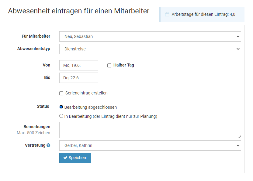 Screenshot: Abwesenheit über das Eingabeformular eingeben