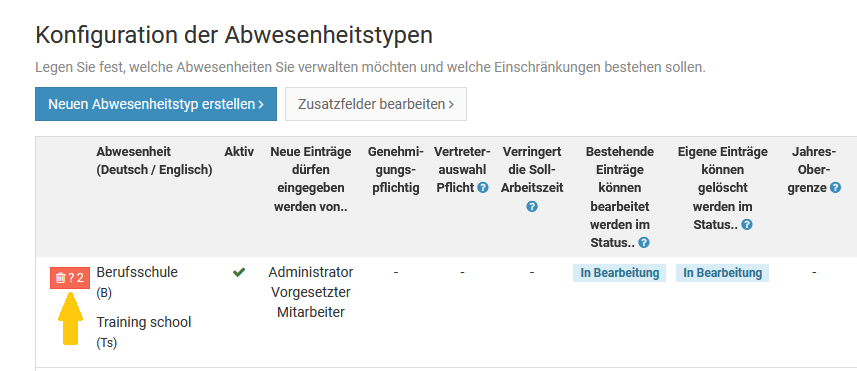 Ein Admin kann für jeden Abwesenheitstyp individuell einstellen, dass dieser die Soll-Arbeitszeit reduziert.